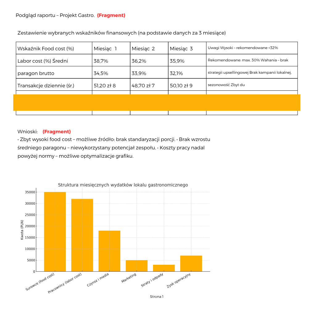 Zyskujesz m.in. analizę danych operacyjnych i finansowych, strukturę kosztów, diagnozę kondycji lokalu i konkretne rekomendacje, co warto optymalizować.